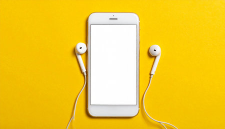A white smartphone with a blank white screen and white earbuds is placed on a yellow background.