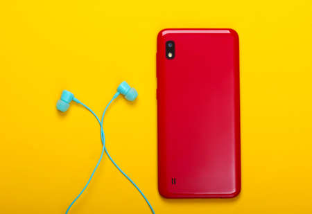 Smartphone with vacuum earphones on yellow background. Top view