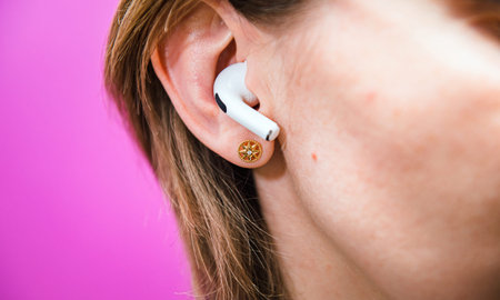 Paris, France - Oct 30, 2019: Meditative woman immersed in music using new Apple Computers AirPods Pro headphones with Active Noise Cancellation for immersive sound purple background