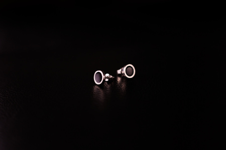 Silver earring macro photo with a precious stone on a black isolated background. Selective focus.