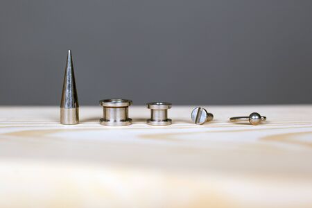 set of accessories for piercing on a wooden board.