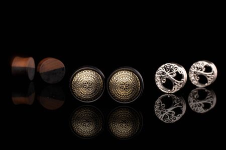 ear jewelry, tunnel and ear dilators on pink background close up