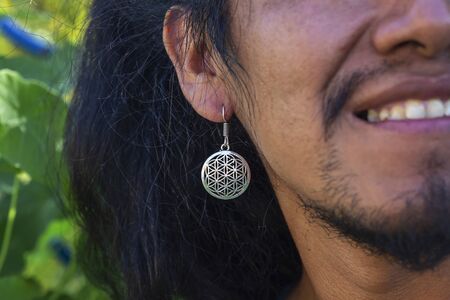 Outdoor closeup of young man wearing cool silver earring