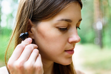 A Woman with Earplug Into Her Ear Close-up