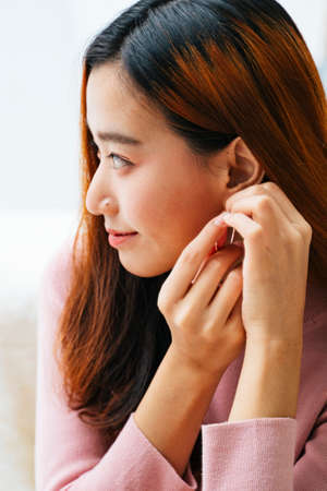 Beautiful asian woman wearing earrings. Jewelry and luxury concept.