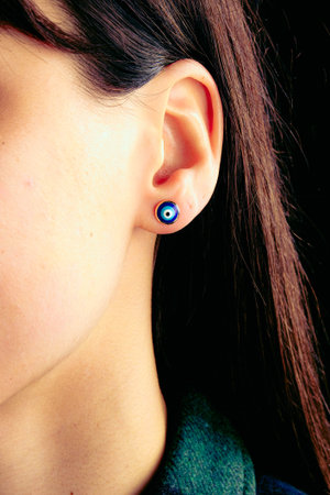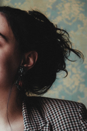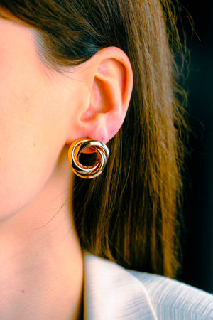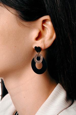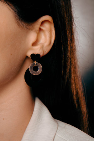 Detail of young woman wearing beautiful luxury earring. Handmade jewellery and accessories