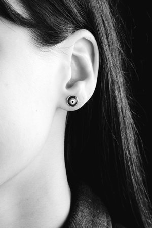 teenager girl ear with round black earring close up photo