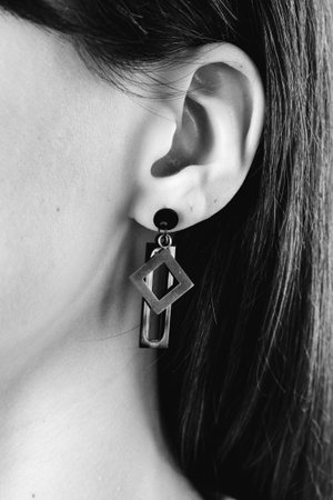 Cropped closeup side portrait of ladys head with tanned skin. The woman is wearing square-shaped stud earring with flat surface and black marbled insertion, posing behind white triangle foreground.