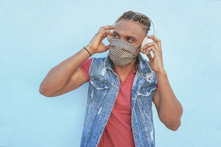 Boy listening music with big headphones outside in coronavirus time protected with face mask on and keeping the social distance