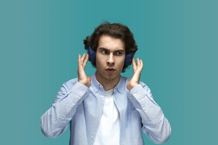 Very interesting sounds. Portrait of a young beautiful man wearing white t-shirt and blue shirt in headphones surprised from music content over blue background