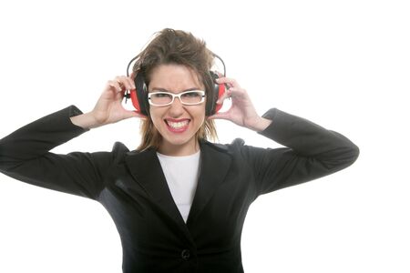 Businesswoman with noise safety headphones and expression
