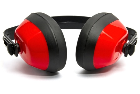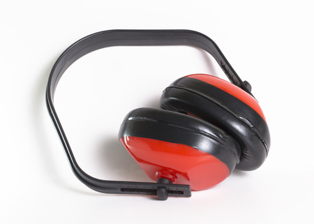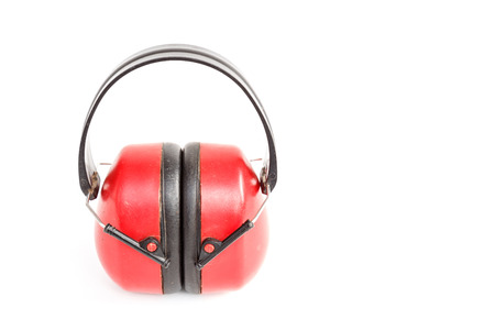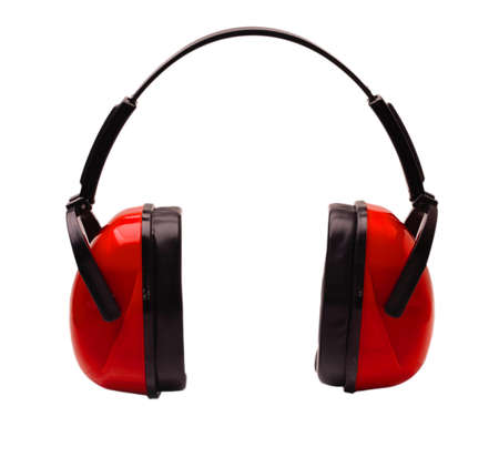 Close up of professional hearing protection with red ear capsules and black temple for work protection in noisy environment on white background earmuff