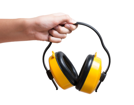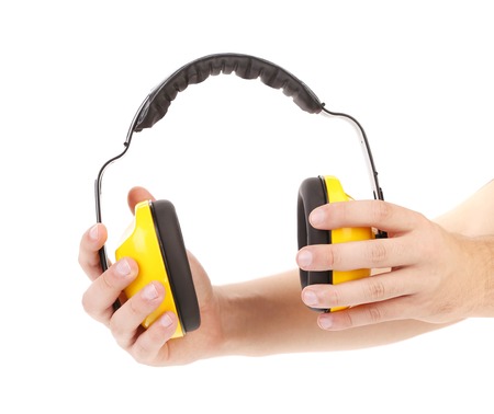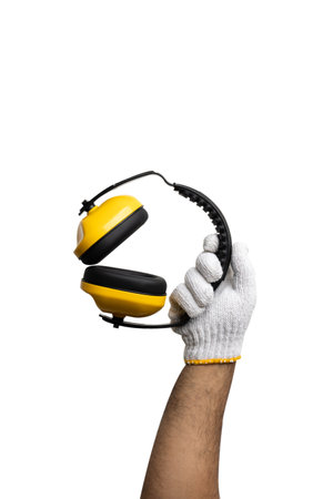 Close up male hand civil engineer holding earmuff standing on isolated white background. Mechanic home service concept.