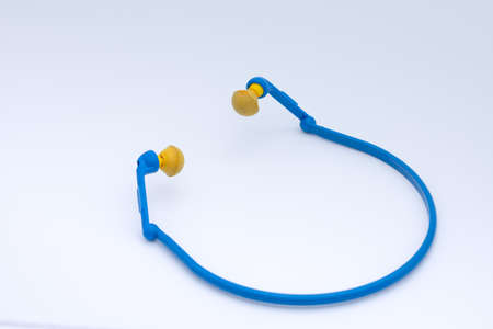 Earphone with yellow ear cushion on a blue background. in-ear headphones. audio equipment. copy space
