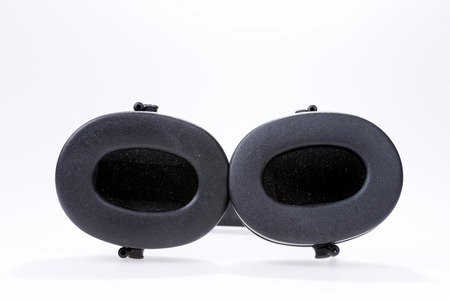 Noise reduction protective earmuffs on scratched metallic surface construction concept.