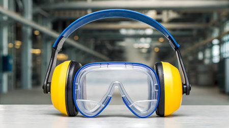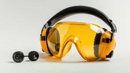 This stock image features safety goggles and ear protection gear suitable for industrial and construction work. The yellow tint provides enhanced visibility, while the adjustable headbands ensure a secure and comfortable fit. Ideal for workplace safety.