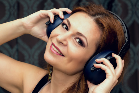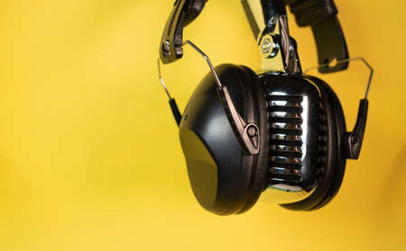 Dj music club concept. Close up old vintage headphones on dark background with colorful light. Selective focus