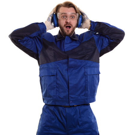 Surprised worker in glasses is standing with his mouth holding his safety headphones isolsted on white background