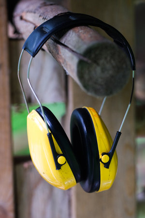 Ear hearing protection. Yellow working protective headphones noise muffs, toolwork in construction site