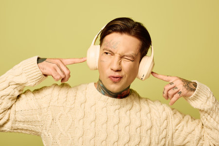 A young man with tattoos playfully listens to music with headphones on, smiling joyfully.
