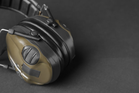 Tactical headphones on black background, closeup with space for text. military training equipment