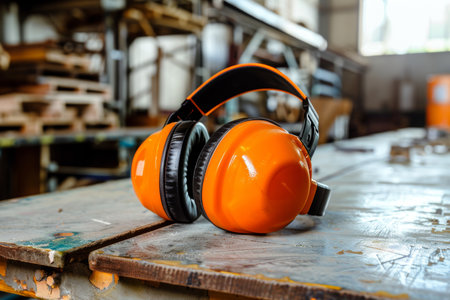 Protective gear focus orange earmuffs on workshop table for construction safety