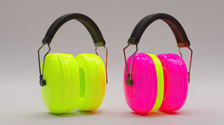 Neon-colored earmuffs for visibility and safety, displayed on a neutral background for promotional use