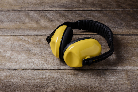 Yellow and black ear muffs for noise reduction and hearing protection resting on weathered gray wooden planks. Protective equipment for construction sites, workshops and industrial environments