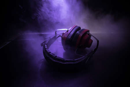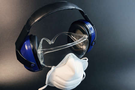 Individual protective equipment, headphones and glasses with respiratory filtering mask, on dark background with copy space