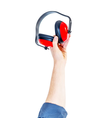 Close up male hand civil engineer holding earmuff standing on isolated white background. Mechanic home service concept.