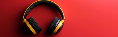 Yellow headphones with black earcups are floating on a red background.