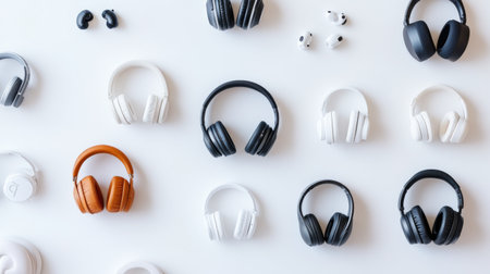 A collection of stylish headphones and earbuds arranged on a white background. Perfect for showcasing modern audio technology in lifestyle or product contexts.