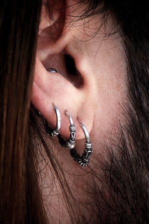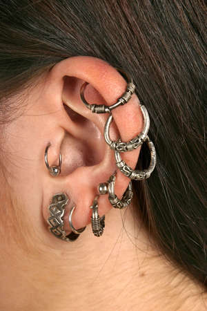 This close-up image showcases a female model's ear adorned with an array of intricate silver earrings. The sparkling accessories highlight contemporary fashion trends.