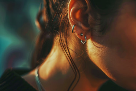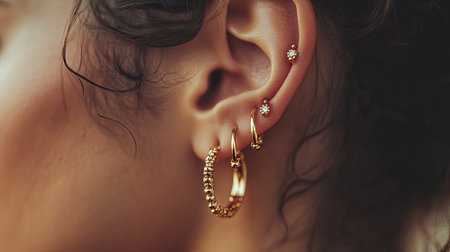 Close-up shot of a woman's ear showcasing stylish and delicate ear piercings, beautifully illuminated with soft lighting and a blurred background, perfect for fashion and beauty concepts.