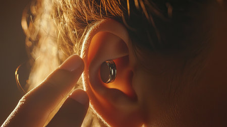 Captivating close-up featuring a beautifully adorned ear with gold earrings, illuminated by warm natural light, showcasing stunning skin texture and curly hair details.