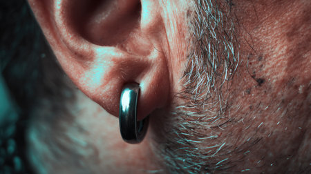This close-up image features a stylish hoop earring worn by a man, emphasizing unique jewelry detail and masculine beauty traits. The focus captures reflections and texture, showcasing individuality.