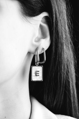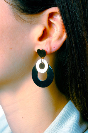A woman's ear wearing mismatched quirky earrings, expressing individual style.