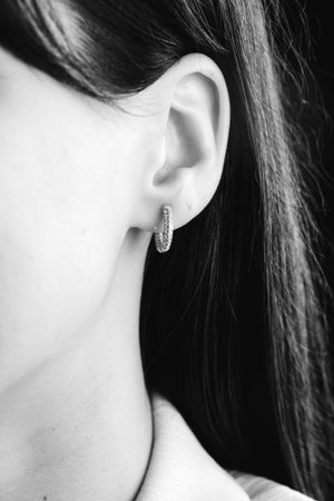 This close-up image features an ear adorned with a silver hoop earring, showcasing detailed textures of skin and hair. The subtle nuances and aesthetic appeal create a striking visual.