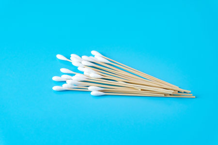 Q-tips, cotton swabs, isolated on bright blue background.