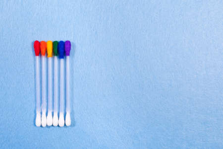 LGBT, protection of human rights concept. Multicolored Q-tip, scotton swabs, in the colors of the flag of sexual minorities against the blue background. Diversity and Inclusion concept.