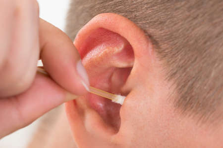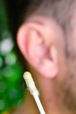 hygiene and body care concept. man using cotton stick for cleaning ear wax,image
