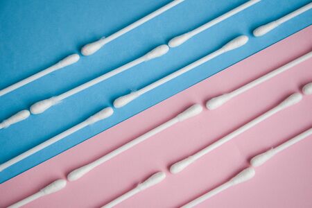 Row of ears sticks on blue and pink. Close up. White cotton swabs on blue and pink background. white plastic cotton buds