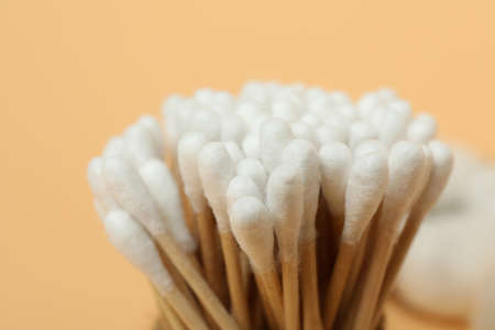 Cotton swabs on beige background, close up