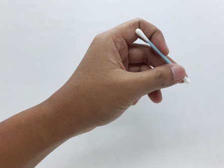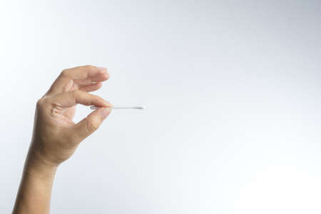 Hand with cotton swab on white background