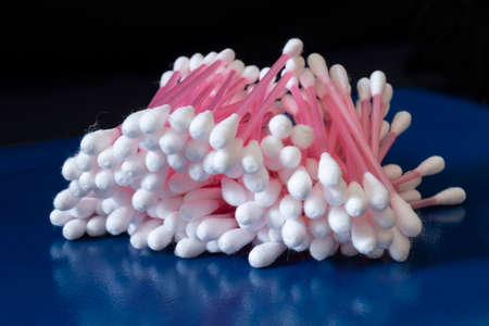 Hygienic cotton swabs on a blue table. Medical items on a black background