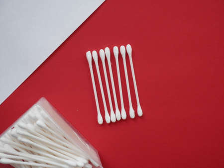 Disposable ear sticks with a red wand are lying on a white background in the upper corner. top view, flat lay, copy space, isolate. High quality photo