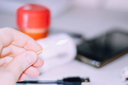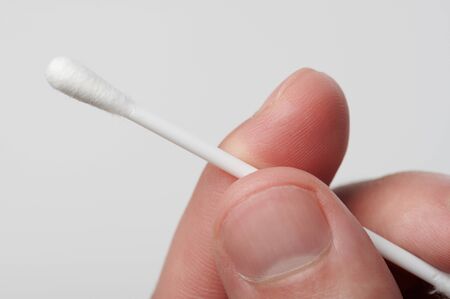 Cotton swab in the fingers to clean ear