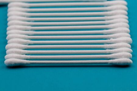 Cotton buds on a blue background. Sanitary hygenic accessory. Plastic waste