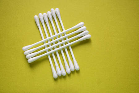 White cotton swabs or buds are on yellow uniform background view from above with clear area of half of photo for labels or headers. Hygienic products for cleaning ears, aural hygiene and cosmetics