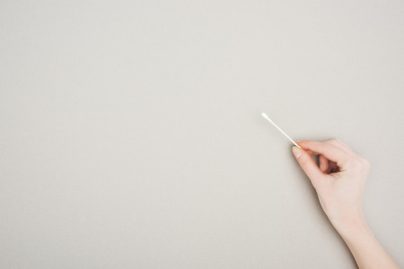 cropped view of woman holding cotton swab on grey background